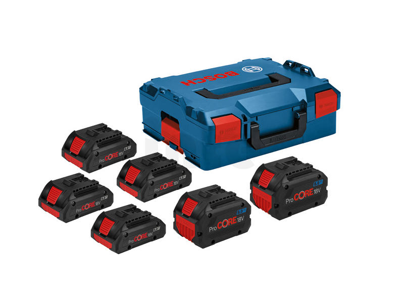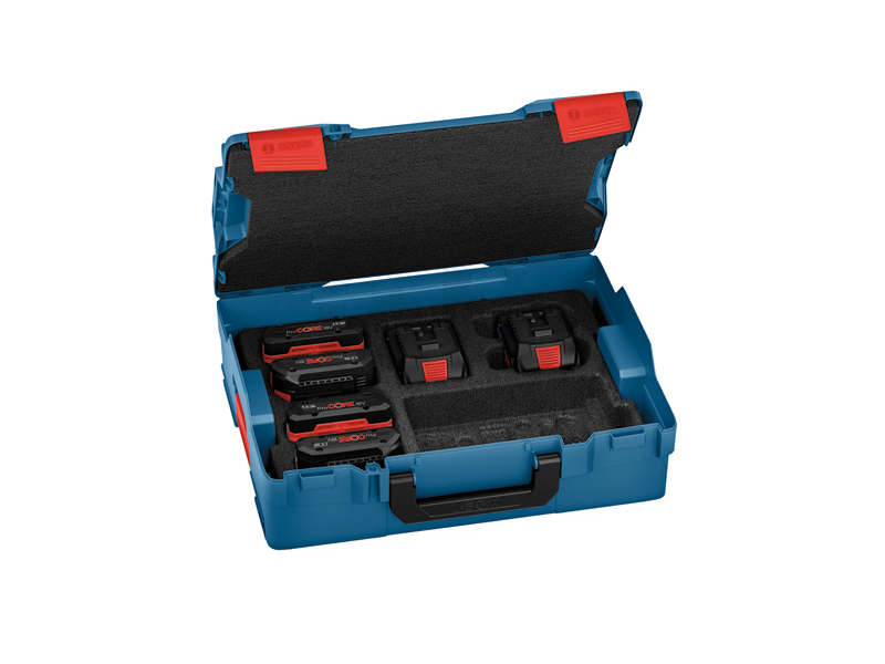 Sada akumulátorů Bosch obsahuje 4 akumulátory ProCore 18V 4Ah a 2 akumulátory ProCore 18V 8Ah, dodávané v praktickém kufru Bosch L-BOXX. Tyto výkonné akumulátory jsou navrženy tak, aby poskytovaly maximální výkon a dlouhou životnost díky nejnovější technologii článků, které snižují vnitřní odpor a produkci tepla.