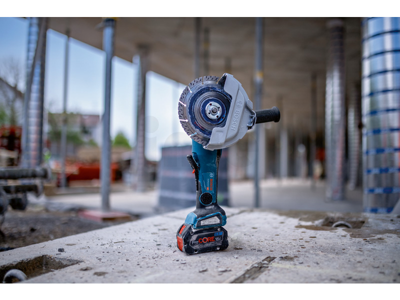 Úhlová bruska je kompatibilní se všemi 18V akumulátory a nabíječkami Bosch Professional (profesionální 18V systém); pro maximální výkonnost použijte ProCORE18V ≥ 5,5 Ah.
