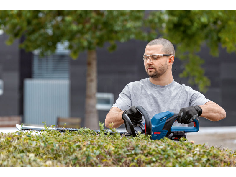 Akumulátorové nůžky na živé ploty GHE 18V-50, Akumulátorové nůžky na živý plot GHE 18V-50 Professional se díky ergonomickému designu snadno ovládají. Výkonný bezuhlíkový motor zajišťuje nepřetržité stříhání středně hustých živých plotů. S kapacitou střihu 20 mm můžete snadno a pohodlně stříhat i silnější větve. Patentovaný systém Bosch Anti-Blocking zabraňuje zaseknutí nožů při stříhání nepoddajných větví díky elektronické detekci a automatickému opakování střihu. Díky své nízké hmotnosti, optimálnímu vyvážení a ergonomickému designu jsou akumulátorové nůžky na živý plot vhodné pro delší práci. Díky nízké hlučnosti a bezemisnímu provozu jsou akumulátorové nůžky na živý plot ideálním nářadím pro práci v obytných nebo jiných oblastech citlivých na hluk. Kompatibilní s profesionálním 18V systémem Bosch a aliancí akumulátorů různých značek AMPShare. Kartonová krabice