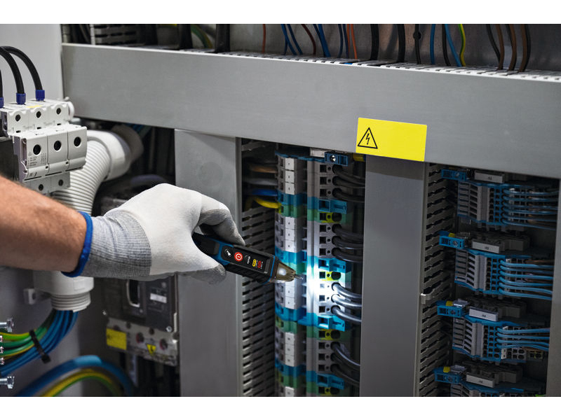 Zkoušečka je vybavena špicí, která svítí červeně, oranžově nebo zeleně a doplněna je zvukovým a vibračním signálem pro jasnou indikaci napětí. Tento nástroj zjednodušuje práci a zvyšuje bezpečnost při nejnáročnějších úkolech, a je nezbytnou součástí výbavy profesionálů pracujících s elektřinou.