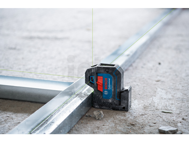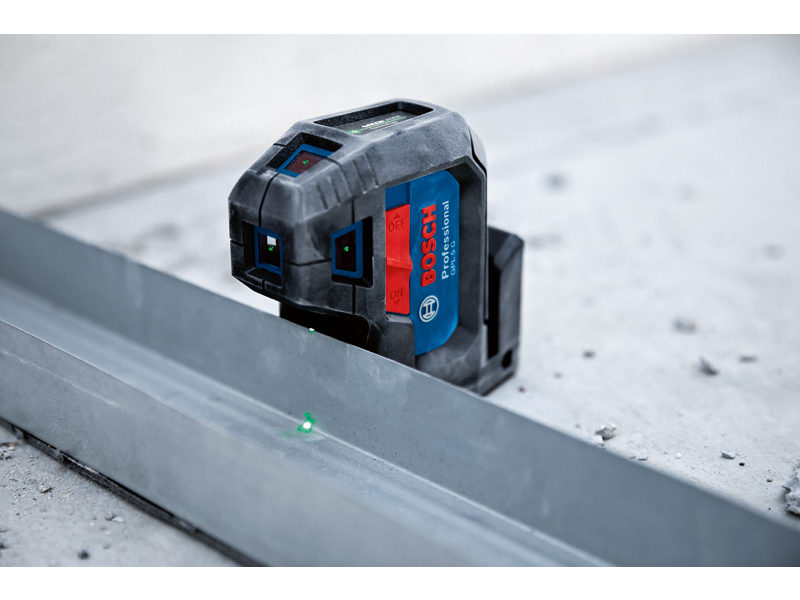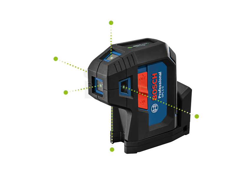 Bodový laser GPL 5 G, Pětibodový laser GPL 5 G Professional vyniká svou odolnou a kompaktní konstrukcí, díky které je ideální volbou při stavbě vzájemně kolmých stěn. Zelené laserové body poskytují až čtyřikrát lepší viditelnost oproti červeným bodům. GPL 5 Professional se svým pogumovaným krytem, zapuštěným sklíčkem a stupni krytí IP 65 proti prachu a stříkající vodě odolá drsným podmínkám na pracovišti. Tento pětibodový laser je připraven na přepravu během chvilky, a to díky integrovanému otočnému držáku se silnými magnety pro rychlé a bezpečné upevnění nářadí. GPL 5 G Professional je ideální na stavbu vzájemně kolmých příček a pro přenášení bodů z podlahy na strop. Je vhodné například na instalaci rozvodů či stavbu konstrukcí pro sádrokartonové stěny. Tento pětibodový laser se rovněž pyšní intuitivním rozhraním s dvoupolohovým spínačem: Je-li zapnutý, přístroj se automaticky samoniveluje, je-li vypnutý, zaaretuje se kyvadlo.