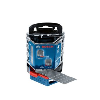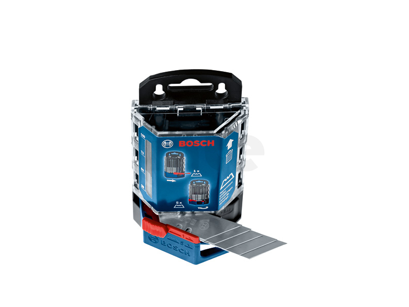 Čepel nože Dávkovač čepelí 50 ks, Zásobník čepelí Bosch Professional obsahuje 50 náhradních břitů, které jsou kompatibilní se všemi standardními univerzálními noži Bosch Professional. Tyto vysoce kvalitní čepele s dlouhou životností jsou vyrobeny z odolné oceli S2 CVM a zajišťují čisté a přesné řezání. Kompaktní, chytře navržený zásobník má výsuvný mechanismus, který může dávkovat buď jednu čepel nebo pět čepelí najednou. Použité čepele lze bezpečně zlikvidovat vložením do horní části dávkovače.