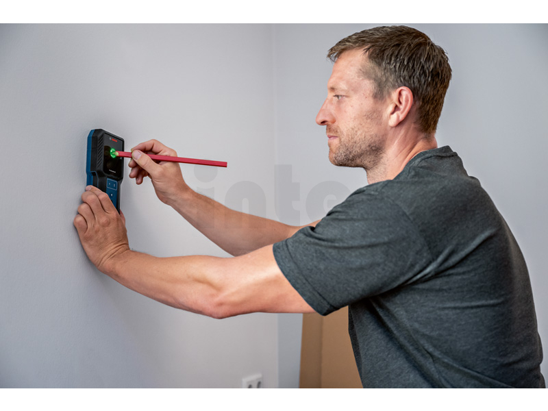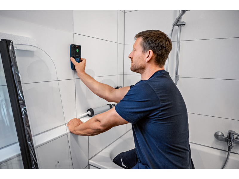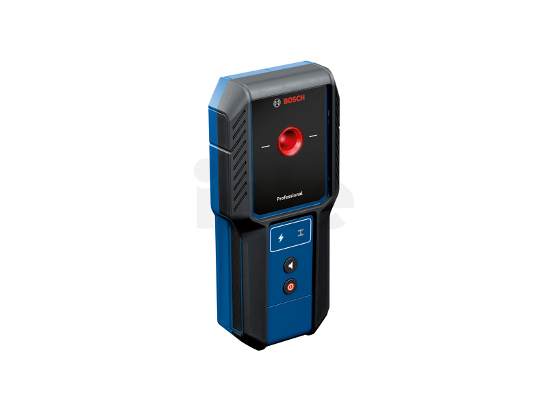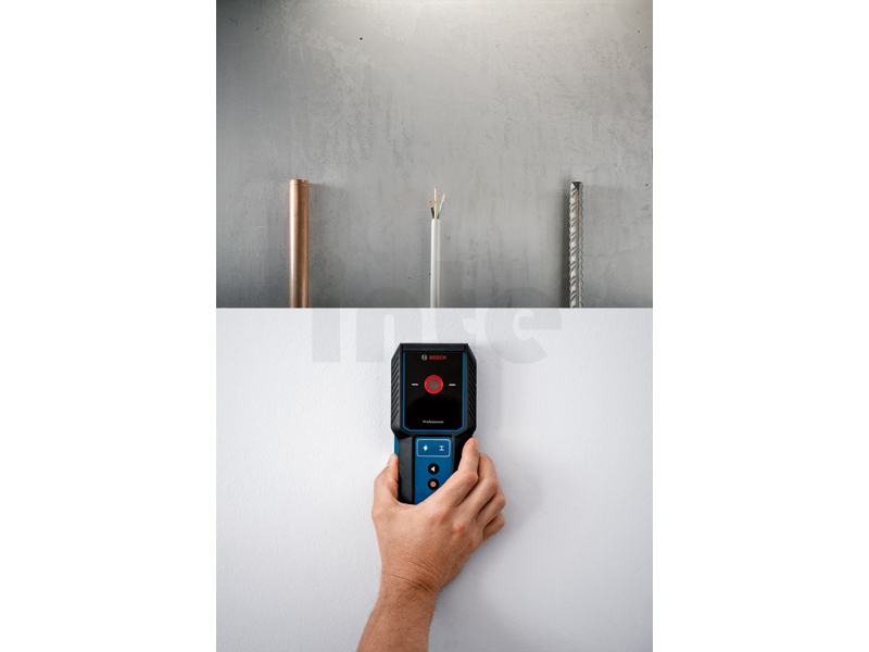 Detektor GMS 100-23, Když vrtáte do zdi, chcete mít jistotu, že nenarazíte na překážku. Detektor GMS 100-23 Professional umožňuje snadnou a intuitivní detekci kovových objektů a vodičů pod napětím ve stěně. Výsledky detekce se zobrazují prostřednictvím otvoru s barevnou signalizací. Detektor je vybaven snadno použitelným ovládáním s jedním režimem a značkovacím otvorem pro vyznačení zjištěných výsledků. Robustní GMS 100-23 byl vyvinut na náročná pracoviště a pyšní se ochranou IP54 proti prachu a stříkající vodě s pryžovým krytem tlumícím nárazy. GMS 100-23 Professional vám pomůže detekovat a lokalizovat kovy a vodiče pod napětím ve stěnách. Lokalizace objektů ve stěně před vrtáním zajišťuje větší bezpečnost při práci, a to zejména pro řemeslníky při renovačních pracích, při věšení skříněk, kuchyňských linek, umyvadel, bojlerů a topných soustav nebo při montáži klimatizace či protipožárních systémů. Detektor identifikuje střed detekovaného objektu a zároveň informuje, zda se jedná o kovový předmět nebo vodič pod napětím.