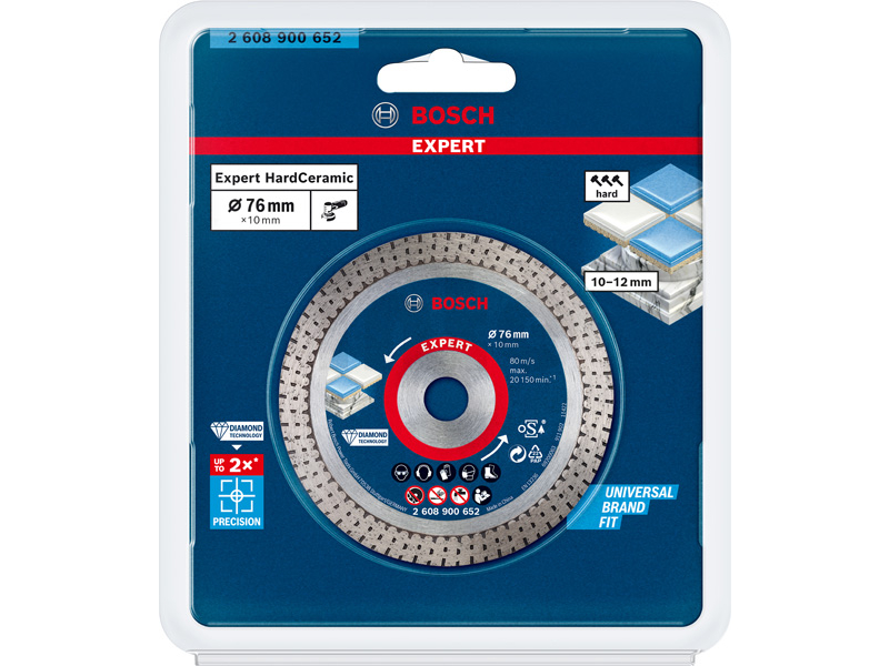 Vysoce přesné řezání tvrdých dlaždic! Dlaždice používané v moderním stavebnictví jsou často velké, velmi tvrdé a drahé. Vysoce kvalitní řezání bez jakýchkoli chyb je proto zásadní, ale velmi obtížné. Řezný kotouč EXPERT HardCeramic na dlaždice využívá technologii Diamond Technology a řadu konstrukčních prvků, které trvale dosahují nejlepších výsledků, a to i u nejtvrdší keramiky. Diamantový řezný kotouč Bosch EXPERT HardCeramic 76mm na dlaždice je pro řezání tvrdých dlaždic nejlepší. S tímto diamantovým dělicím kotoučem se můžete spolehnout na profesionální výsledky každé své práce.