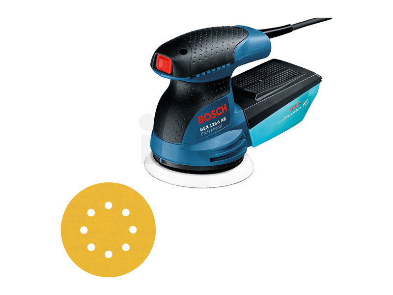 Excentrická bruska GEX 125-1 AE, GEX 125-1 AE Professional je excentrická bruska od firmy Bosch základní třídy v kategorii 125 mm určená na menší plochy a lokální opravy. Její kompaktní a ergonomická konstrukce s variabilními možnostmi úchopu poskytuje mimořádné pohodlí i při práci nad hlavou. Předvolba rychlosti umožňuje práci s různými materiály. Nádoba na prach je osazena vestavěným mikrofiltračním systémem Bosch zajišťujícím efektivní odsávání prachu pro prakticky bezprašnou práci. Tato excentrická bruska je určena na broušení, mezibroušení, odstraňování laku a na finální povrchové úpravy různých materiálů. Lze použít na dřevo, dýhu, lak, plniva i minerály a akryl. Je kompatibilní se systémem Bosch Click & Clean. GEX 125-1 AE Professional rovněž obsahuje brusnou podložku opatřenou systémem na suchý zip pro přichycení brusného papíru. Mikrofiltrační box (číslo náhradního dílu 2 609 199 133); 1× brusný list C430, Expert for Wood + Paint, 120 (dostupný samostatně jako sada 5 ks: 2 608 605 643)