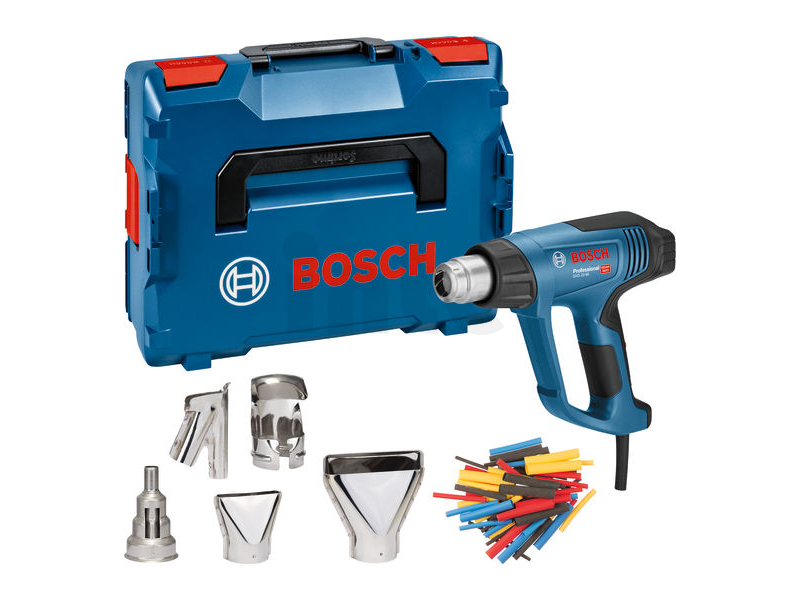 Horkovzdušná pistole GHG 23-66, Horkovzdušná pistole GHG 23-66 Professional vám poskytuje úplnou kontrolu nad teplotou a prouděním vzduchu. Na výběr je 10 stupňů proudění vzduchu, digitálně nastavitelná teplota v krocích po 10 °C a čtyři přizpůsobitelné programy uložené do paměti. Tyto funkce lze snadno nastavit na displeji. Toto nářadí snadno dosáhne teploty až 650 °C. Navíc se pyšní dlouhou životností díky automatické funkci tepelné ochrany, která vypne topnou jednotku, i když ventilátor stále běží. Vyznačuje se praktickou fází chlazení a stabilní polohou pro vychladnutí. Tato horkovzdušná pistole je ideální na celou řadu prací, jako je svařování plastů a trubek, odpájení a smršťování trubek, zejména pokud pro danou práci potřebujete specifickou teplotu nebo proud vzduchu. L-BOXX 136 (1 600 A01 2G0); Plochá tryska 50 mm (1 609 201 795); Redukční tryska, 9 mm (1 609 201 797); Svařovací botka, 10 mm (1 609 201 798); Reflektorová tryska, 32 × 33 mm (1 609 390 453); Tryska na ochranu skla 75 mm PHG-N3 (1 609 390 452); Sada smršťovacích trubiček (1 609 201 812)