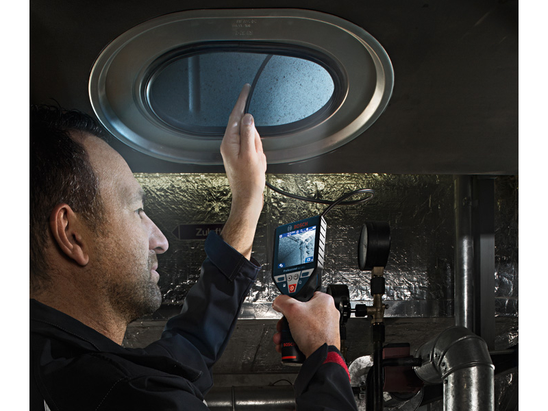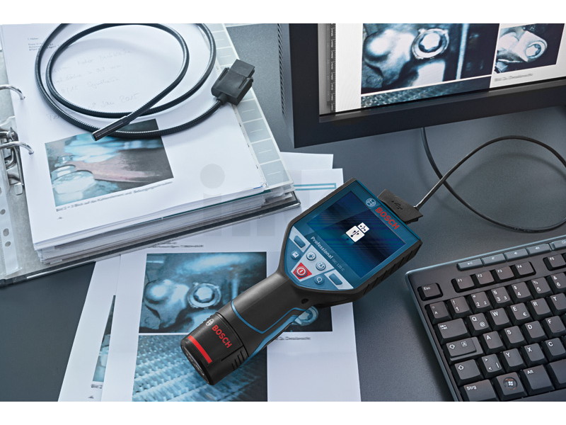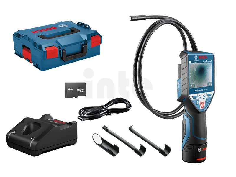 Inspekční kamera GIC 120 C, Monitorovací kamera GIC 120 C Professional je ideální na kontrolu špatně přístupných míst a zaznamenávání výsledků. Funkce ‘Up is Up’™ otáčí a přizpůsobuje snímek na větší obrazovce, a zajišťuje tak optimální orientaci v prostoru. Pro vysoce kvalitní dokumentaci a rychlé ukládání je možné snímky a videa přenášet přímo přes mikro USB kabel. Technologie duálního zdroje napájení umožňuje použití s akumulátorem 12 V Li-ion nebo alkalickými bateriemi. Endoskopická kamera je perfektní pro mnoho kutilských prací, například při nahlížení do rozvodných skříní či potrubí, do dutin stěny, a při práci s hydraulickými systémy či při opravách automobilů. GIC 120 C Professional je vybaven technologií Quick Connector, která umožňuje rychlou a snadnou výměnu kabelu kamery a též uspořádané ukládání přístroje. Kompaktní konstrukce s ideální ergonomií zajišťuje to nejlepší ovládání v každé možné situaci. Kabel kamery o délce 120 cm s jasným LED světlem nabízí dostatečný dosah do úzkých prostorů a osvětlení tmavých míst pro jasný přehled. Kabel kamery pro GIC 120 C, průměr 8,5 mm, délka 120 cm (1 600 A00 9B9); Hák, magnet, zrcátko; L-BOXX 136 (1 600 A01 2G0); Vložka pro L-BOXX; Micro-USB kabel; 4GB MicroSD karta; 1× akumulátor GBA 12V 2.0Ah (1 600 Z00 02X); Rychlonabíječka GAL 12V-40 Professional (1 600 A01 9R3)