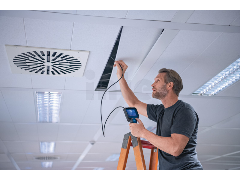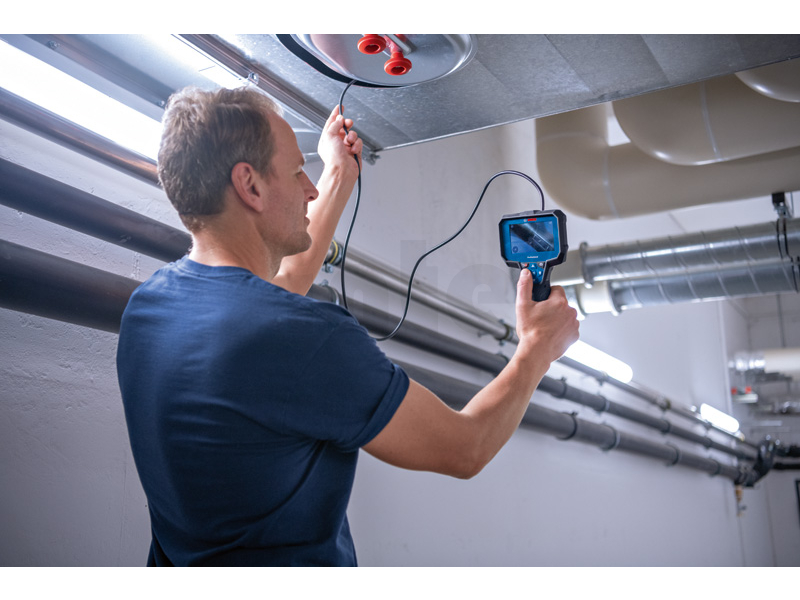 Inspekční kamera GIC 12V-4-23 C, Inspekční kamera GIC 12V-4-23 C Professional je ideální nářadí pro topenáře, instalatéry, automechaniky nebo elektrikáře. Je vybavena velkým 4,3" monitorem a jasným obrazem ve vysokém rozlišení 800 × 480 pixelů, což umožňuje rychlou a intuitivní analýzu potrubí, kanálů nebo jiných těžko přístupných míst. Orientaci obrazu snadno určíte díky praktické značce Up, která vždy směřuje nahoru. Tato ergonomická kamera s robustní konstrukcí je určena k použití na náročná pracoviště a do těžko přístupných míst. Hlava kamery nese stupeň krytí IP67, které ji chrání před prachem a krátkodobým ponořením do vody, a tělo nářadí má krytí IP54 proti prachu a stříkající vodě. Tato inspekční kamera je ideální pro řemeslníky na rozmanité práce, například na kontrolu vnitřních prostor rozvodných skříní, potrubí a dutin ve stěnách i na hydraulické systémy a použití v automobilovém průmyslu. Fotografie pořízené pomocí přístroje GIC 12V-4-23 C Professional se snadno přenáší přes kabel USB-C®. Kabel kamery pro GIC, průměr 8,3 mm, délka 1,5 m (1 600 A02 R6M); Hák, magnet, zrcátko; Kabel USB-C®; Adaptér na alkalické baterie AA1 (1 608 M00 C1B); 4× baterie 1,5 V LR6 (AA)