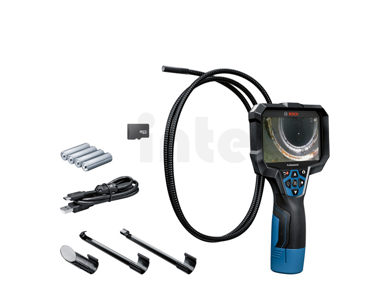 Inspekční kamera GIC 12V-5-27 C, Inspekční kamera GIC 12V-5-27 C Professional přináší nové pohodlí všem topenářům, instalatérům, elektrikářům i automechanikům. Tento ergonomický přístroj se vyznačuje velkým 5" displejem s velmi vysokým rozlišením 1 280 × 720 pro podrobný náhled při kontrole potrubí, kanálů a dalších těžko přístupných míst. Během používání není nutné upravovat orientaci obrazu, a to díky jedinečné funkci AutoUp, která zaručuje automatické otočení obrazu směrem nahoru bez ohledu na to, jakým směrem je natočena hlava kamery. Tato robustní kamera je navržena tak, aby odolala prachu i vodě na náročných pracovištích. Hlava kamery nese stupeň krytí IP67, které ji chrání před prachem a krátkodobým ponořením do vody, a tělo nářadí má krytí IP54 proti prachu a stříkající vodě. Inspekční kamera se dokonale hodí pro řemeslníky na rozmanité práce, například na kontrolu vnitřních prostor rozvodných skříní, potrubí a dutin ve stěnách, i na hydraulické systémy a použití v automobilovém průmyslu. Snímky a videa se z přístroje GIC 12V-5-27 C Professional snadno přenáší pomocí kabelu USB-C® nebo karty Micro SD. Kabel kamery pro GIC, průměr 8,3 mm, délka 1,5 m (1 600 A02 R6M); Hák, magnet, zrcátko; Adaptér na akumulátor (1600A017HF/1600A017HH); 4× baterie 1,5 V LR6 (AA); Kabel USB-C®; Karta mikro SD, 32 GB
