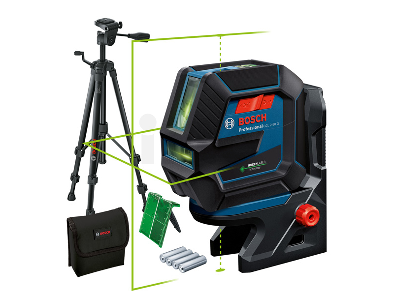 Kombinovaný laser GCL 2-50 G, Kombinovaný laser na staveniště GCL 2-50 G Professional usnadňuje zarovnávání a přenosy. Díky odolnému designu s pogumovaným krytem, který zajišťuje lepší ochranu zapuštěných skel, a stupni krytí IP 64 proti prachu a stříkající vodě je možné se stále soustředit na práci. Vypínač a jednotlačítková klávesnice usnadňují ovládání. Pro okamžitý začátek práce je u GCL stále aktivní režim příjmu laserového paprsku. Vysoce viditelné zelené laserové čáry a zelené kolmé body zaručují lepší viditelnost i v jasném prostředí. Rychlé a bezpečné upínání díky otočnému držáku RM 10 Professional s velmi silnými magnety. RM 10 Professional umožňuje přesné polohování laserových čar u kolmých bodů. Robustní GCL 2-50 G Professional je ideální na celou řadu aplikací, jako je montáž profilů na sádrokartonové stěny, montáž zásuvek a dveří a přenos bodů pro drobnější instalace. GCL 2-50 G Professional poskytuje dosah laserových čar až do 15 m (kolmé body: až do 10 m), který lze za pomoci volitelného přijímače LR 7 Professional prodloužit až na 50 m. RM 10 Professional je kompatibilní s volitelnou svorkou na strop DK 10 Professional pro použití na stropě či jemné seřizování výšky. Stavební stativ BT 150 Professional (0 601 096 B00); Otočný držák RM 10 Professional (0 601 092 A00); Cílová destička laseru; Taška; 4× baterie 1,5 V LR6 (AA)