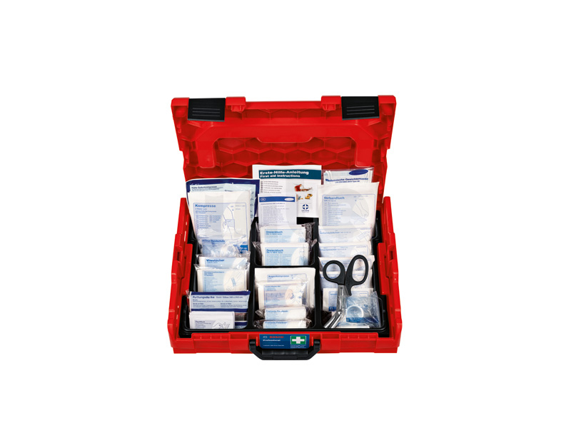 Kufrový systém Lékárnička L-BOXX 102, Jako profesionál víte, že nehody se stávají. A také víte, že když k nim dojde, je třeba mít po ruce lékárničku. Rádi vám pomůžeme: Lékárnička Bosch Professional je v souladu s normou DIN 13157 a dodává se v L-BOXXu 102, který je součástí systému Bosch Mobility. To vám dává naprostou flexibilitu, protože je vaše lékárnička kompatibilní se všemi ostatními variantami L-BOXXu. Klíčovými prvky robustní konstrukce L-BOXXu jsou bezpečně uzavíratelné západky a odolný materiál, zatímco přídavné přední madlo usnadňuje přenášení boxu blízko u těla. L-BOXX na lékárničku má červenou barvu. V případě nouze ji mezi ostatními modrými L-BOXXy rychle najdete. Stačí lékárničku nacvaknout na jiný L-BOXX a spolu s ostatním vybavením ji pohodlně přenést na další staveniště. L-BOXX s lékárničkou je vhodný na skladování a přepravu se systémem Sortimo do vozidla, Aluminium Caddy a L-BOXX Roller. 1× náplast, DIN 13019, 2,5 cm × 5 m; 12× samolepicí náplast, DIN 13019, 10 cm × 6 cm; 6× náplast na prst, 5 × 4 cm; 6× náplast na prst, 12 × 2 cm; 6× proužky náplastí, 19 × 72 mm; 12× proužky náplastí, 25 × 72 mm; 1× obvaz na první pomoc, DIN 13151-K; 3× obvaz na první pomoc, DIN 13151-M; 1× obvaz na první pomoc, DIN 13151-G; 1× obvaz na popáleniny, DIN 13152-A, 60 × 80 cm; 6× kompres, 10 × 10 cm; 2× kompres na oči, oválný 50 × 70 mm; 1× instantní chladivý kompres; 1× izotermická fólie 210 × 160 cm, zlatá/stříbrná; 2× obinadlo, FB 6, DIN 61634, 6 cm × 4 m; 2× obinadlo, FB 8, DIN 61634, 8 cm × 4 m; 2× trojúhelníkové obinadlo, bílé, DIN 13168, 96 × 96 × 136 cm ; 1× nůžky, DIN 58279-B190, zahnuté; 5× vatový čtverec; 4× jednorázové rukavice, vinylové; 2× jednorázová lékařská maska ; 2× mikroténový sáček, uzavíratelný; 1× pokyny pro první pomoc; 1× obsah; 4× čisticí ubrousek