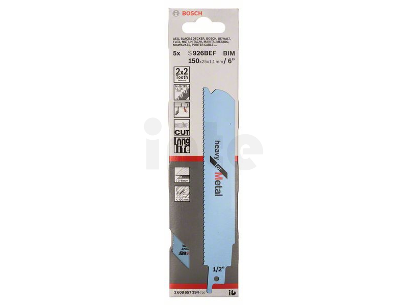 Pilový list do pily ocasky S 926 BEF Heavy for Metal poskytuje přesné a plynulé přímé řezání kovu. Široká čepel (25 mm) ve spojení s tloušťkou materiálu (1,1 mm) umožňují přesné přímé řezání. Geometrie s jemnou roztečí zubů 2 × 2 pilového listu usnadňuje práci. Bimetalová čepel je navržena pro řezání ocelových materiálů. Tento pilový list s jemnou roztečí zubů (1,4 + 1,8 mm) řeže tenkostěnné trubky a profily o tloušťce stěny 3 až 8 mm. Standardní délka čepele 150 mm umožňuje řezání materiálu o tloušťce až 100 mm.