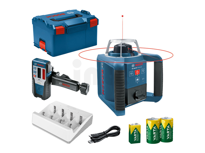 Rotační laser GRL 300 HV + LR 1 v L-BOXX, Jednoduchá manipulace díky horizontální a vertikální samonivelaci, Snadná obsluha díky intuitivnímu ovládání - co tlačítko, to funkce, Rychle nastavitelný v horizontálním a vertikálním směru díky automatické samonivelaci v rozsahu 8 % (±5°), Zapínatelná funkce varování před nárazem zabraňuje nesprávné nivelaci při vibracích a otřesech, Laserový přijímač LR 1 Professional (0 601 015 400); L-BOXX 238 (1 600 A01 2G2); 2× akumulátor 1,2 V HR20 (D) VARTA; 1× akumulátor 9V 7HR9V VARTA; 1× nabíječka VARTA
