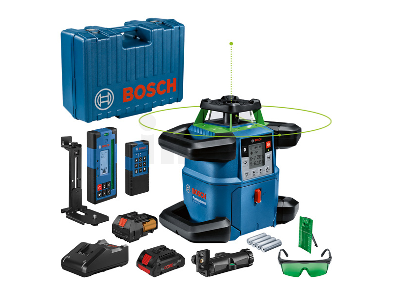 Rotační laser GRL 650 CHVG, Robustní rotační laser GRL 650 CHVG Professional s konektivitou Bluetooth® pozdvihá nivelaci na staveništi na novou úroveň přesnosti a účinnosti. Technologie zeleného laseru zajišťuje vyšší viditelnost za různých světelných podmínek. Rotační laser se pyšní odolnou konstrukcí do drsných podmínek na pracovišti i do nepříznivého počasí, ustojí převržení stativu a pád z výšky až 2 metry a vyznačuje se stupněm krytí IP68 proti prachu a vodě. Využití aplikace Levelling Remote k přehledu o nastavení a vzdálenému ovládání šetří čas a umožňuje naprosté soustředění na práci. Všestranný přístroj GRL 650 CHVG Professional se nejlépe hodí na venkovní nivelaci a stupňování, například při stavbě příček, montáži stropu a vzduchotechniky. Duální zdroj napájení zajišťuje dlouhou dobu chodu s využitím dobíjecího akumulátoru Bosch 18 V Li-ion nebo alkalických baterií D-Cell. Optimální pohodlí díky špičkovým prvkům, jako je displej, duální sklon, paměť sklonu a vysoce kvalitní přijímač (LR 65 G Professional). Laserový přijímač LR 65 G Professional (0 601 069 T00); Držák přijímače RB 60 Professional; Dálkové ovládání RC 6 Professional; 1× akumulátor ProCORE18V 4.0Ah (1 600 A01 6GB); Rychlonabíječka GAL 18V-40 Professional (1 600 A01 9RJ); Adaptér pro akumulátory BA 1; Nástěnný držák WM 6 Professional; 4× baterie 1,5 V LR20 (D); 4× baterie 1,5 V LR6 (AA); Cílová destička laseru; Brýle pro práci s laserem (zelené) (číslo náhradního dílu 1 608 M00 05J); Příruční kufr