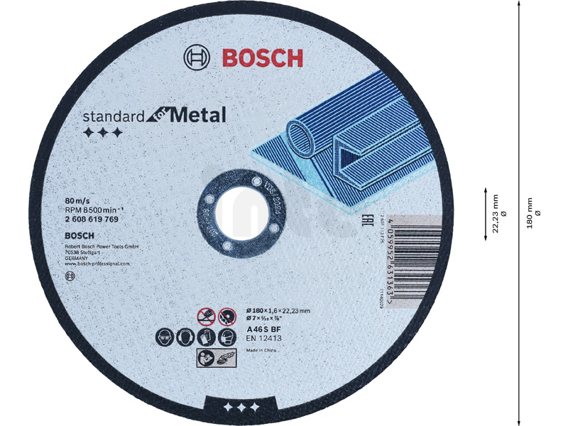 Řezný kotouč Standard for Metal spolehlivě řeže kovové materiály. Kotouč je zhotoven z oxidu hlinitého a je navržen k obecnému použití pro kov. Tento kotouč používejte k řezání kovu. Řezné kotouče Bosch vyhovují požadavkům na maximální bezpečnost, např. EN 12413.