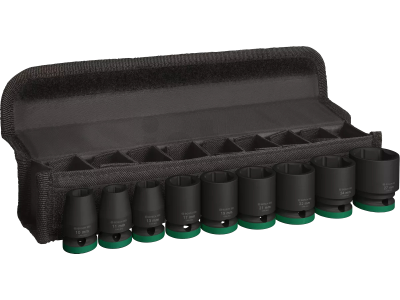 BOSCH Sada PRO Impact Socket Set (2608003039) je navržena pro použití s rázovými utahováky se čtyřhranným upínáním. Tato sada je ideální pro práci se šestihrannými šrouby a maticemi, a to zejména v těžkém průmyslu a na stavbách závodů. Hlavice jsou vyrobeny z tepelně zpracované chrom-molybdenové oceli (CRMO), což zaručuje jejich odolnost vůči vysokému krouticímu momentu. Černý fosfátový povlak chrání hlavice před korozí. Díky laserovému a barevnému označení je snadná identifikace správné hlavice. Drážky a průchozí otvory umožňují bezpečné upevnění na rázovém utahováku.