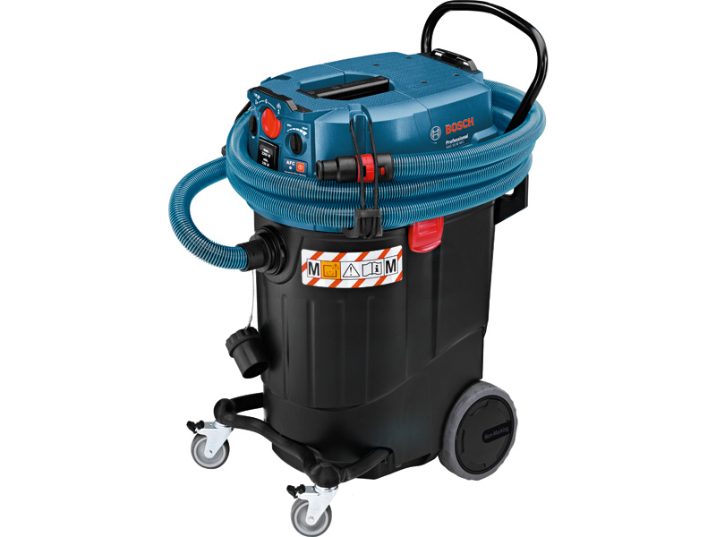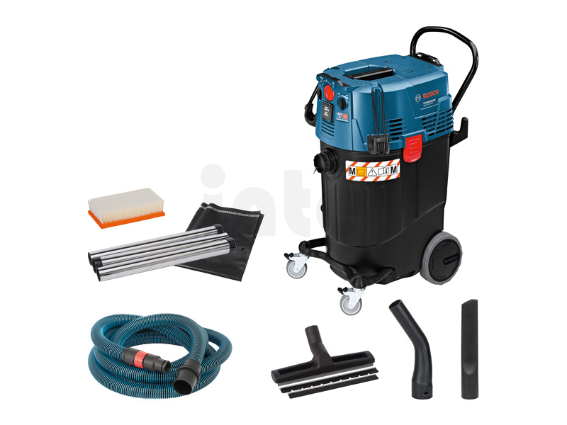 Síťový vysavač GAS 55 M AFC, Mnohostranný vysavač na mokré a suché sání s automatickým čištěním filtru a velkým objemem sběrné nádoby, Prostorově úsporný plochý skládaný filtr pro optimální využití nádoby o objemu 55 l – ideální pro velké množství prachu, Trvalá sací síla pro nepřetržitý postup práce díky automatickému čištění filtru (AFC), Jako certifikovaný vysavač třídy prachu M podle normy EU pokrývá vysávání velkého spektra prachu pro vysokou ochranu uživatele, Štěrbinovitá hubice, průměr 35 mm (2 607 000 165); Odpadní sáček (2 607 432 043); Koleno (2 608 000 573); Podlahová hubice, průměr 35 mm (1 609 390 478); 1× plochý skládaný filtr PES (2 607 432 034); 3× 0,35m sací trubice chromovaná, 35 mm průměr (2 608 000 575); Hadice 5 m, průměr 35 mm, antistatická, s objímkou pro nářadí (2 608 000 566)