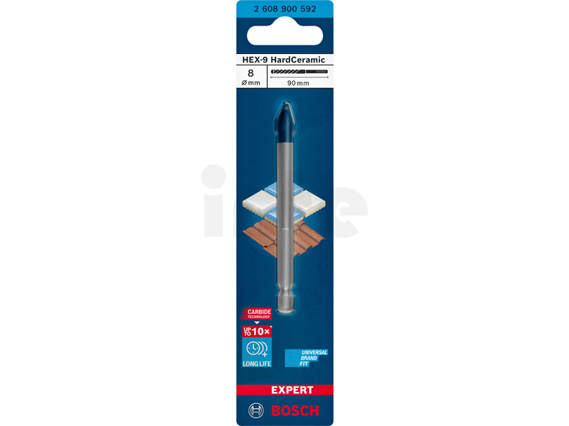 Dlouhá životnost při vrtání do tvrdých dlaždic! Vzhledem k tomu, že obklady jsou stále větší i tvrdší, vrtání otvorů do nich je pro vrtáky na obklady velmi náročné. Proto společnost Bosch vyvinula vrták EXPERT HardCeramic, který je schopen vrtat do tvrdé keramiky za sucha a vydrží mnohem déle než naše standardní vrtáky na dlaždice. Vrták Bosch EXPERT HEX-9 HardCeramic je určen pro vrtání do dlažby a dokáže vrtat otvory do tvrdých dlaždic bez použití maziva nebo chladiva.