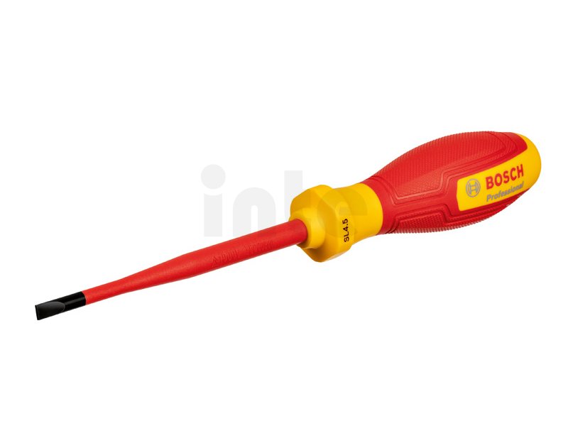 Šroubovák Šroubovák VDE SL 4,5 × 100, Jako profesionální řemeslník potřebujete nářadí, které se snadno používá a splňuje všechny zákonné požadavky. Se šroubovákem Bosch Professional VDE SL 4,5 × 10 můžete utahovat a povolovat šrouby, i když se nečekaně dostanete do kontaktu s částmi pod napětím. Toto standardní nářadí je izolováno termoplastickým elastomerem (TPE). Bylo testováno až do 10 000 V a certifikováno podle normy DIN EN/IEC 60900 až do 1 000 V. Každý šroubovák VDE je přesný a odolný; jeho štíhlý dřík a robustní hrot zajišťují precizní montáž. Měkká rukojeť a vynikající ergonomický design jsou příjemné do ruky a pohodlně se s nimi pracuje. Čepel šroubováku S2 je opatřená izolačním ochranným povlakem a rukojeť je izolovaná TPE. S ručním nářadí VDE v naší řadě Bosch Professional se bude veškeré vaše nářadí pyšnit spolehlivou kvalitou značky Bosch Design šroubováků Bosch Professional VDE zabraňuje jejich odkutálení na pracovišti. Profil a velikost mají navíc viditelně vyznačené na více pozicích na rukojeti. Štítek