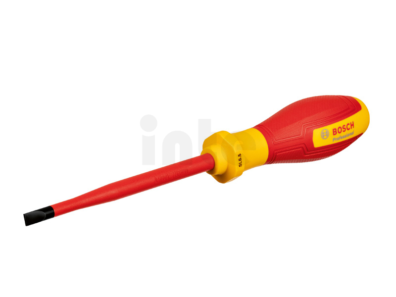 Šroubovák VDE SL 6,5 × 125, Jako profesionální řemeslník potřebujete nářadí, které se snadno používá a splňuje všechny zákonné požadavky. Se šroubovákem Bosch Professional VDE SL 6,5 × 125 můžete utahovat a povolovat šrouby, i když se nečekaně dostanete do kontaktu s částmi pod napětím. Toto standardní nářadí je izolováno termoplastickým elastomerem (TPE). Bylo testováno až do 10 000 V a certifikováno podle normy DIN EN/IEC 60900 až do 1 000 V. Každý šroubovák VDE je přesný a odolný; jeho štíhlý dřík a robustní hrot zajišťují precizní montáž. Měkká rukojeť a vynikající ergonomický design jsou příjemné do ruky a pohodlně se s nimi pracuje. Čepel šroubováku S2 je opatřená izolačním ochranným povlakem a rukojeť je izolovaná TPE. S ručním nářadí VDE v naší řadě Bosch Professional se bude veškeré vaše nářadí pyšnit spolehlivou kvalitou značky Bosch. Design šroubováků Bosch Professional VDE zabraňuje jejich odkutálení na pracovišti. Profil a velikost mají navíc viditelně vyznačené na více pozicích na rukojeti. Štítek