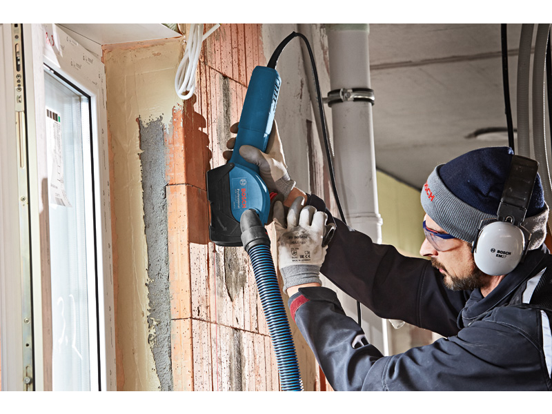 Systémové příslušenství GDE 125 EA-T, Téměř bezprašné řezání kamene s malými úhlovými bruskami, Pro čistou práci: již téměř žádné čištění po práci, Jednoduchá manipulace: pohodlné připojení k úhlové brusce a vysavači, Funguje s mnoha úhlovými bruskami Bosch o průměru 125 mm