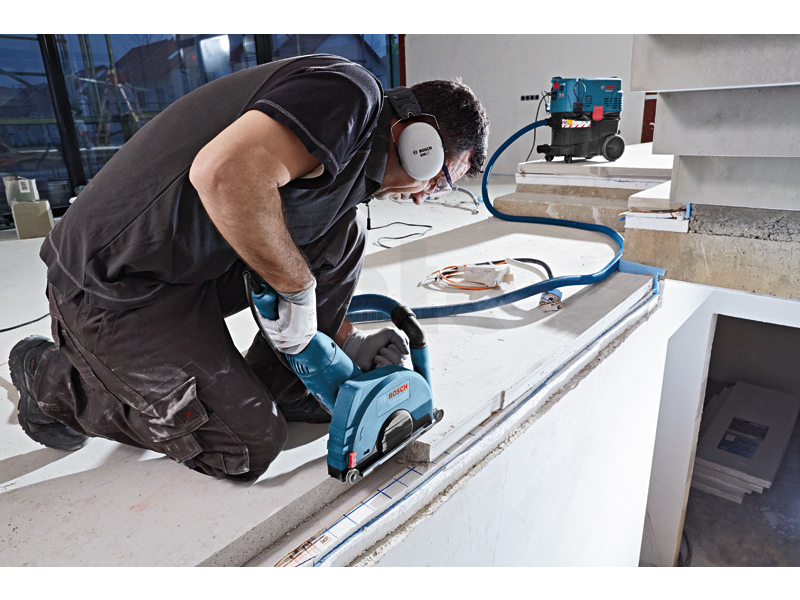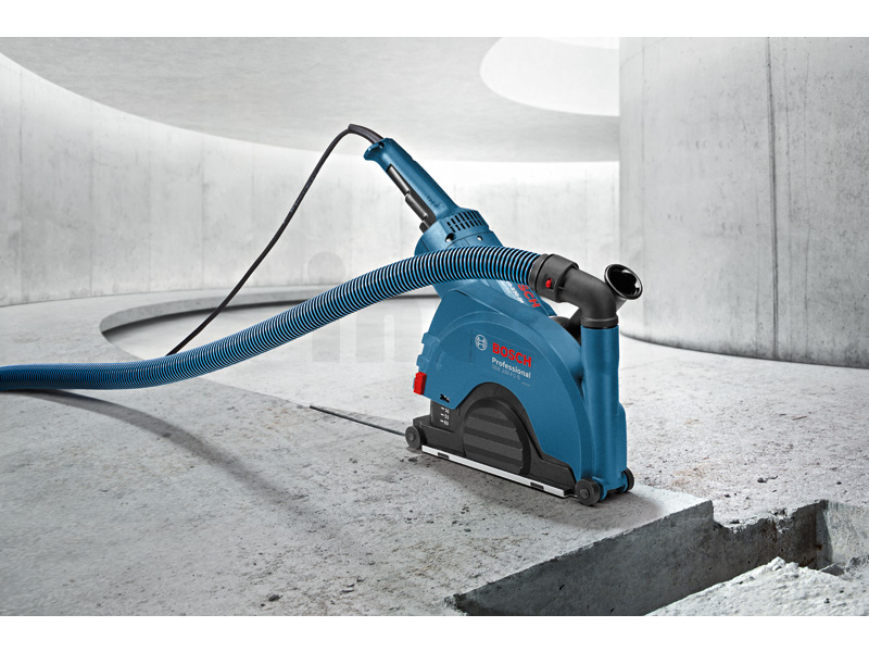 Systémové příslušenství GDE 230 FC-S, Téměř bezprašné řezání kamene s velkými úhlovými bruskami, Pro čistou práci: již téměř žádné čištění po práci, Jednoduchá manipulace: pohodlné připojení k úhlové brusce a vysavači, Funguje s mnoha úhlovými bruskami Bosch o průměru 230 mm