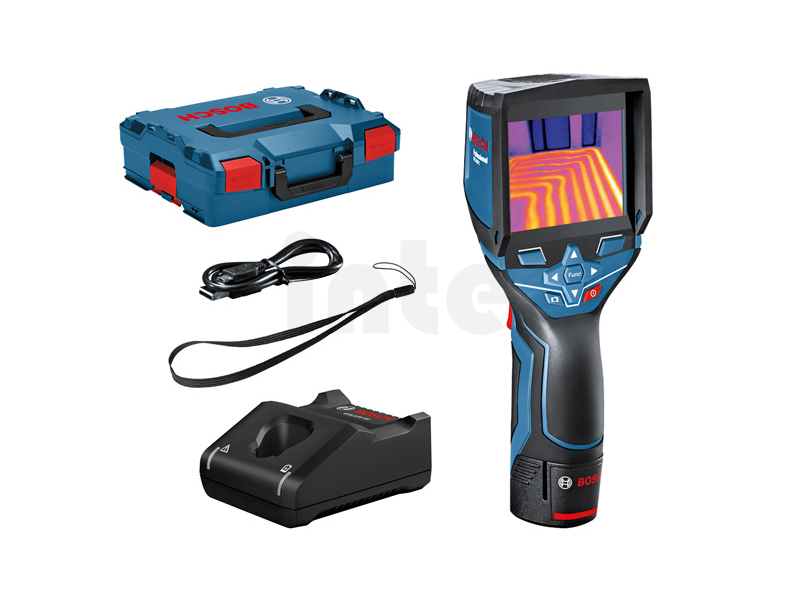 Termokamera GTC 400 C, Termokamera GTC 400 C Professional během několika sekund změří a znázorní teplotní rozdíly a snadno zaznamenává výsledky. Aplikace Bosch ThermalOn rychle dokumentuje a předává naměřené hodnoty. Inteligentní technologie snímek v snímku překrývá reálný a termální snímek (19 200 PX) a výsledkem je vysoce kvalitní obrazová dokumentace a přesná lokalizace teplotních rozdílů. Díky duálnímu systému napájení lze používat jak 12V Li-ion akumulátor, tak standardní alkalické baterie. Ideální na kontrolu izolace, topných systémů, proudění tepla a na vyhledání přehřátých částí. Chytrý přístroj GTC 400 C Professional je perfektní pomocník pro řadu specialistů v každé fázi projektu: od konzultace se zákazníky a zobrazení jasných aktuálních snímků přes přípravné práce, např. lokalizaci stávajících rozvodů, po projektovou dokumentaci i následné práce. Tento měřicí nástroj nesmí být použit pro lékařské účely na člověku. 1× akumulátor GBA 12V 2.0Ah (1 600 Z00 02X); L-BOXX 136 (1 600 A01 2G0); Vložka na nářadí pro L-BOXX; Rychlonabíječka GAL 12V-40 Professional (1 600 A01 9R3); Kabel mikro USB (2 609 120 670); Poutko na zápěstí