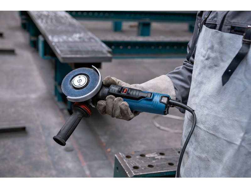 Úhlová bruska GWS 17-125 PS, GWS 17-125 PS Professional s funkcí Speed Selection zaručuje maximální pohodlí během používání díky ergonomické a štíhlé rukojeti. Spínač PROtection okamžitě po uvolnění spouště vypne úhlovou brusku. Její vysoký výkon, robustnost a vylepšená ochrana vůči prachu díky průduchům na zadní straně nářadí zaručují maximální produktivitu. Úroveň ochrany uživatele ještě zvyšují funkce, jako je KickBack Control, Restart Protection a postranní rukojeť s Vibration Control. Malá úhlová bruska je nejlepším nářadím na broušení kovu a svarů i na dělení kovu, betonu, cihel a dlaždic. Je kompatibilní se systémy na odsávání prachu Bosch GDE 125 EA-T Professional a GDE 115 / 125 FC-T Professional. Mezi další funkce patří Speed Selection, Constant Speed, Soft Start a Overload Protection. Kartonová krabice; Přídavná rukojeť s tlumením vibrací (2 608 900 000); Ochranný kryt (1 605 510 365); Nacvakávací ochranný kryt na řezání – kov (2 608 000 756); Kolíkový klíč (1 607 950 043); Upínací příruba (1 605 703 099); Upínací matice (1 603 340 040); Filtr na prach (2 608 000 824)