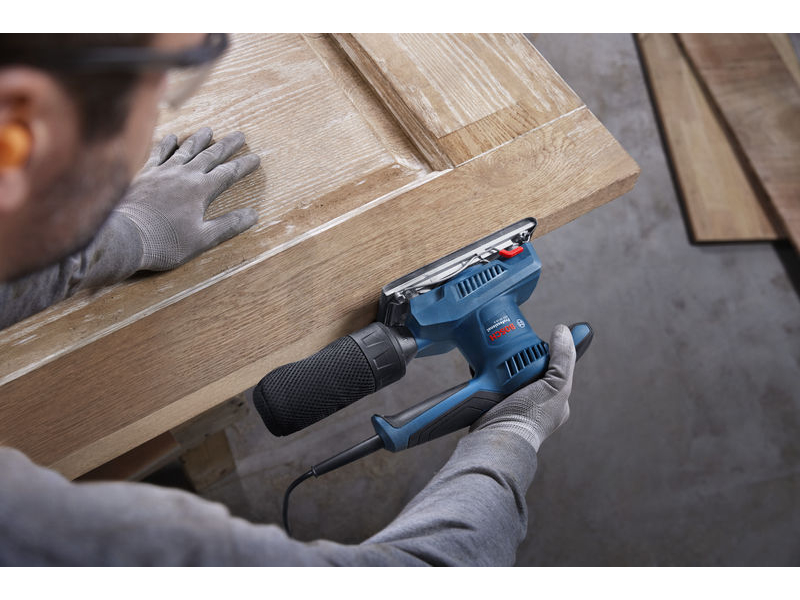 Bruska je vybavena ergonomickou protiskluzovou rukojetí, která zajišťuje pohodlnou práci bez námahy. Je ideální pro instalatéry skříní a tesaře, kteří ji mohou využít k broušení velkých ploch před lakováním, vyhlazování spár a broušení hran.