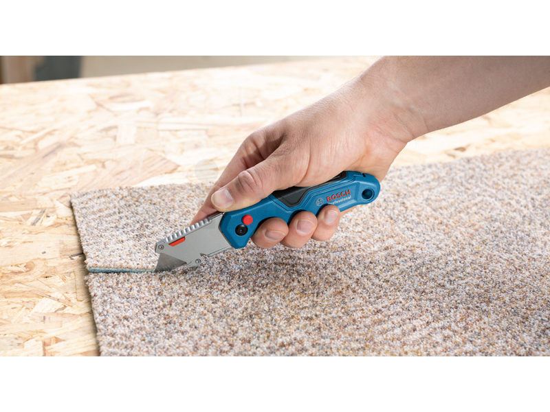 Nůž Zavírací nůž, Univerzální zavírací nůž Bosch Professional je velmi všestranný nezbytný pomocník do každé bedny na nářadí. Díky ergonomickému tvaru a měkké rukojeti se pohodlně používá a má velkou opěrku pro palec, která umožňuje při řezání vyvinout větší tlak. Mechanismus otevírání a zavírání pomocí jednoho tlačítka a výměna čepelí bez nástrojů zajišťují rychlost a pohodlí. V rukojeti jsou uloženy tři náhradní čepele. Štítek