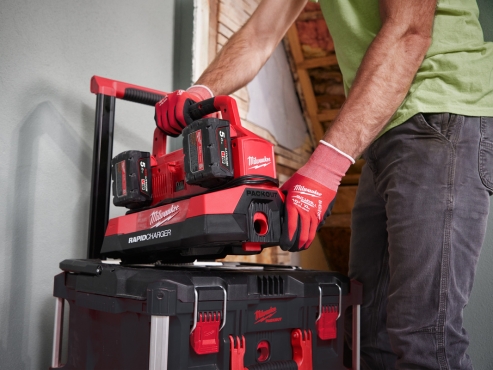 Milwaukee nabízí unikátní nabíječky, které lze pevně připojit k PACKOUT systému a používat přímo na modulární věži.