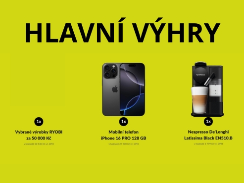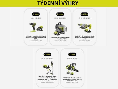 Velká akce RYOBI® je zpět! Nakupte produkty RYOBI® v období od 1. listopadu do 7. prosince 2025, zaregistrujte účtenku a hrajte o hodnotné ceny. Ve hře je hlavní výhra – produkty RYOBI® v hodnotě přes 50 000 Kč, dále iPhone 16 PRO nebo kávovar Nespresso De’Longhi. Každý týden navíc probíhá losování o týdenní výhry z nabídky produktů RYOBI®.