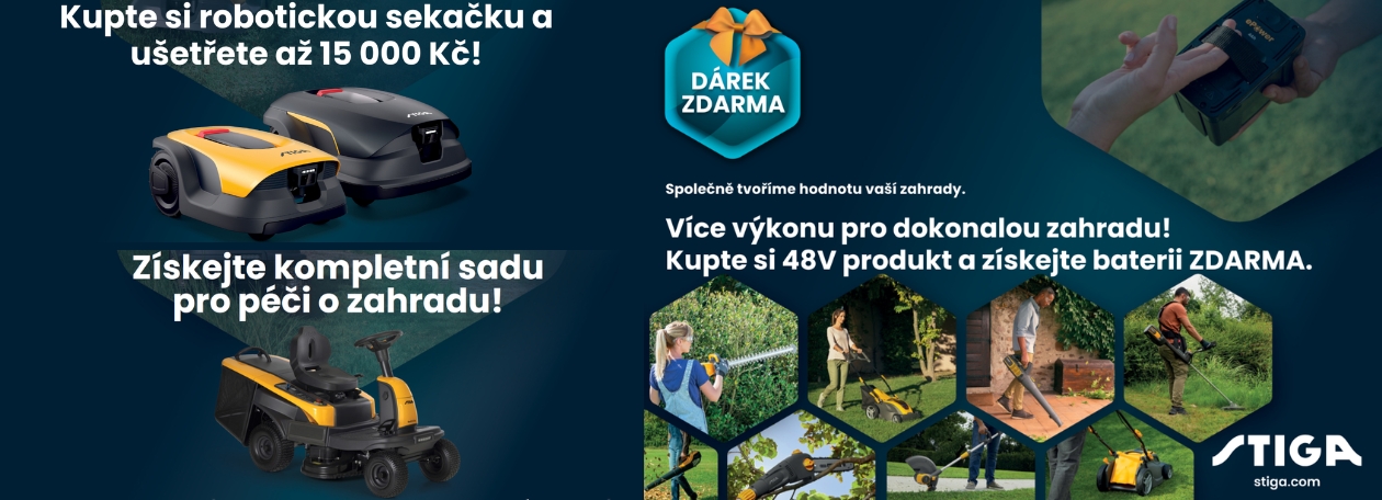 Vyberte si moderní robotickou sekačku, zahradní rider nebo akumulátorové nářadí STIGA a získejte bonusy, které vám ušetří tisíce korun.