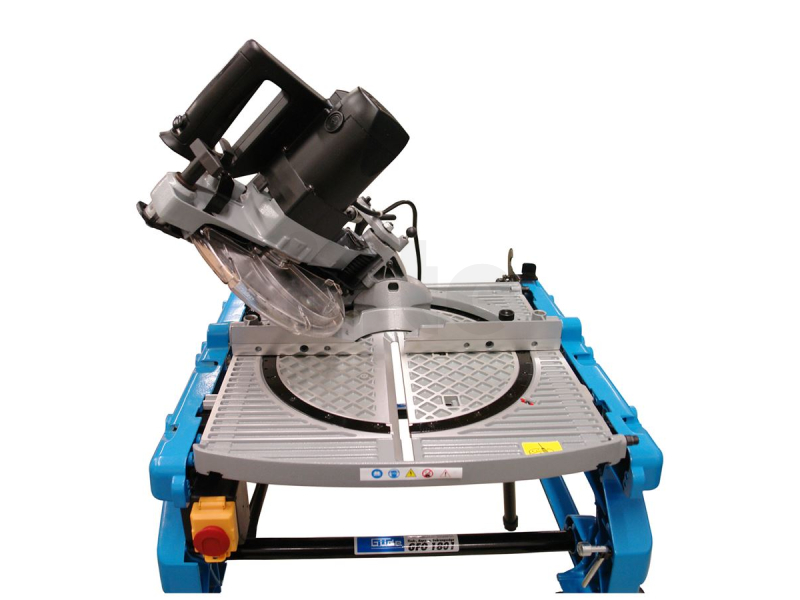 Motor 1.800 W/P1, bezpečnostní spínač. Konstrukce: robustní litinový rám s transportními kolečky, hliníkový pracovní stůl (-> 558 x 500 mm), ochranný kryt pilového kotouče, přípojka odsávání/sběrný pytlík, podélný/úhlový doraz, rychloupínací svěrka obrobku, výklopné stojné nohy.