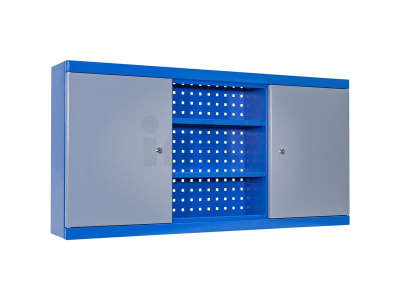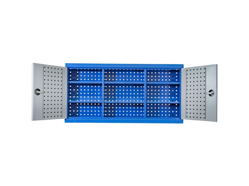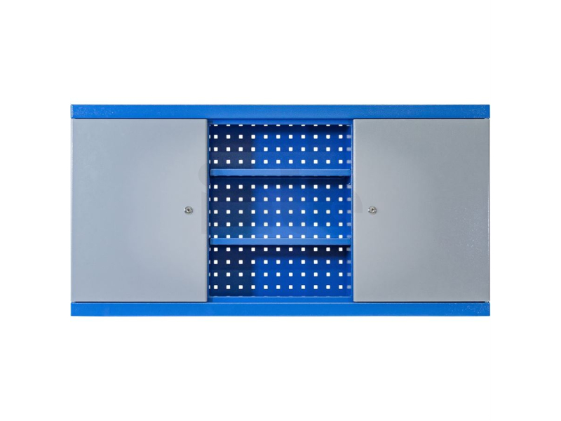 Dvoudveřová skříňka se zadním děrovaným panelem (-> zavěšení nástrojů/nářadí) a odkládacími policemi.