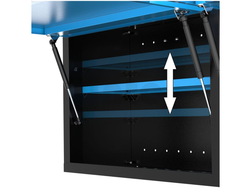 Vybavení: 2 ukládací police (-> max. nosnost: 15 kg; s 3 - polohovým nastavením výšky), výklopná dvířka s teleskopickými vzpěrami (4).