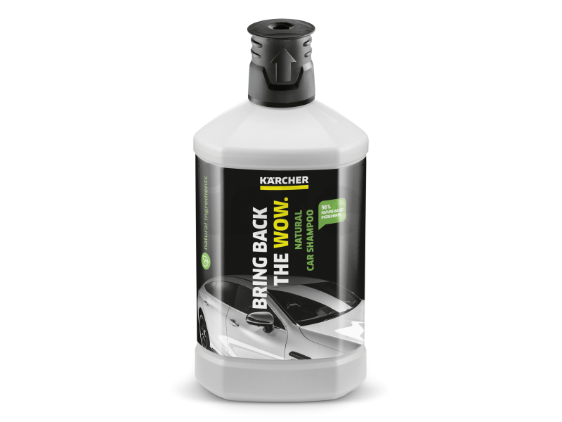 KÄRCHER přírodní autošampon RM 610N s 98 % přírodními složkami, rostlinnými tenzidy a rýžovým voskem zajišťuje šetrné a účinné mytí vozidel s dlouhotrvajícím leskem a ochranou laku.