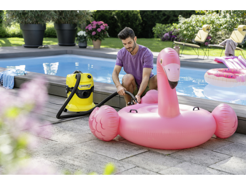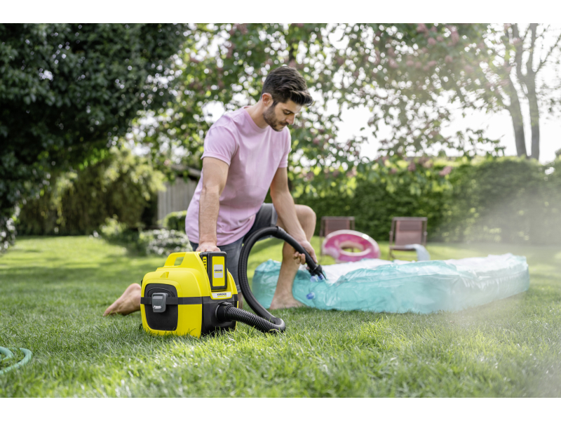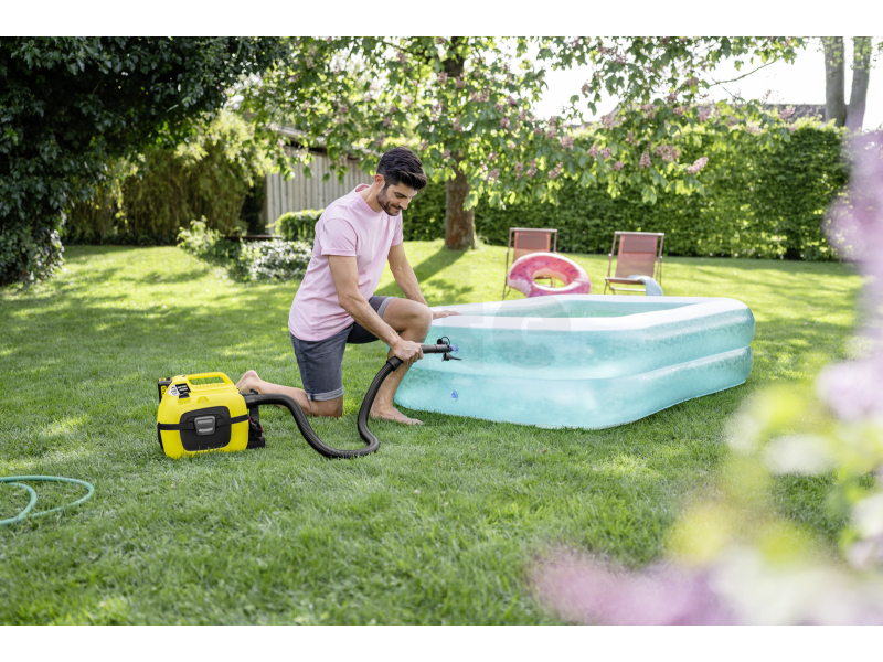 Po připojení hadice k sací přípojce vysavače Kärcher WD umožňuje sada také rychlé vyfouknutí vzduchu z nafukovacích výrobků, což výrazně usnadňuje jejich skladování a manipulaci. Tento praktický systém nafukování a vyfukování pomocí vysavače šetří nejen čas, ale i fyzickou námahu.