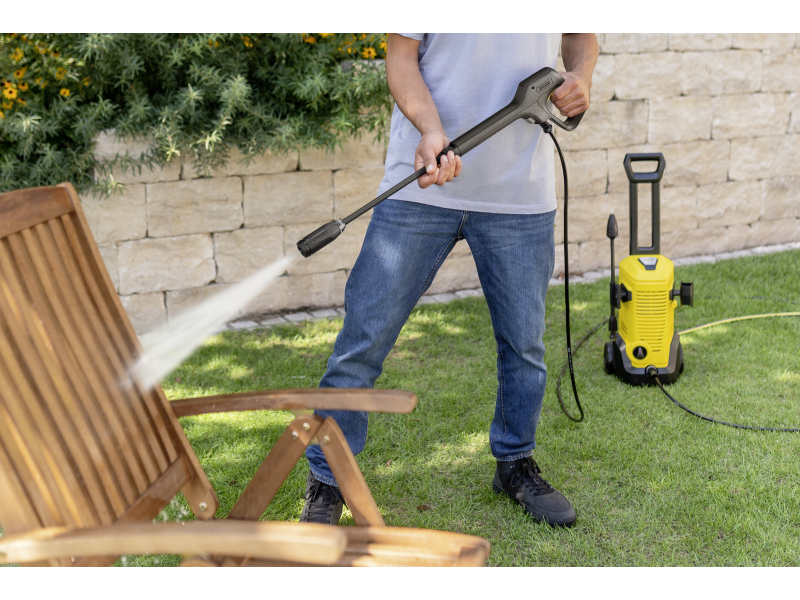 Tryska umožňuje rychlé přizpůsobení tlaku od šetrného oplachu až po účinné odstranění nečistot. To zajišťuje pohodlnější práci, lepší kontrolu nad čištěním a vyšší efektivitu, ať už čistíte zahradní nábytek, kola, terasy nebo vozidla.