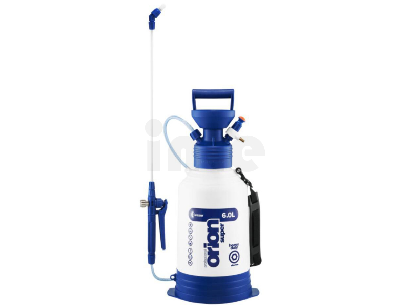 Postřikovač KWAZAR Orion Super Air HD Alka line 6 l s kompresorovou přípojkou nabízí efektivní zpěňování a pohodlné doplňování tlaku bez nutnosti ručního pumpování, ideální pro profesionální použití.