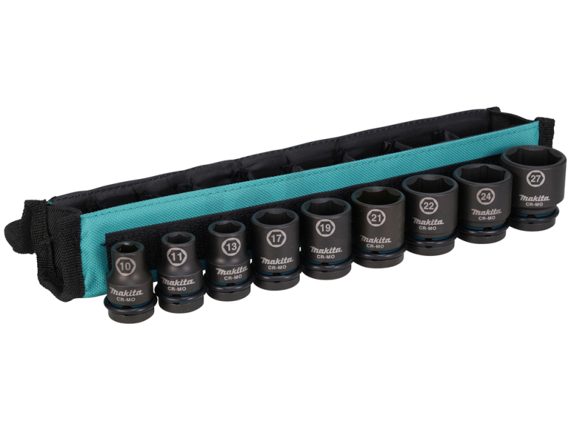 Sada rázových nástrčných klíčů 1/2", délka 38 mm. Sada obsahuje nástavce 10, 11, 13, 17, 19, 21, 22, 24, 27 mm. Baleno v odolném nylonovém pouzdře.