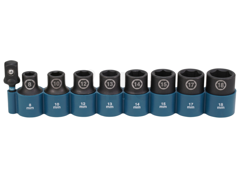 Sada rázových nástrčných klíčů 1/2" v rozměrech 8, 10, 12, 13, 14, 15, 17, 18 mm. Délka 38 mm