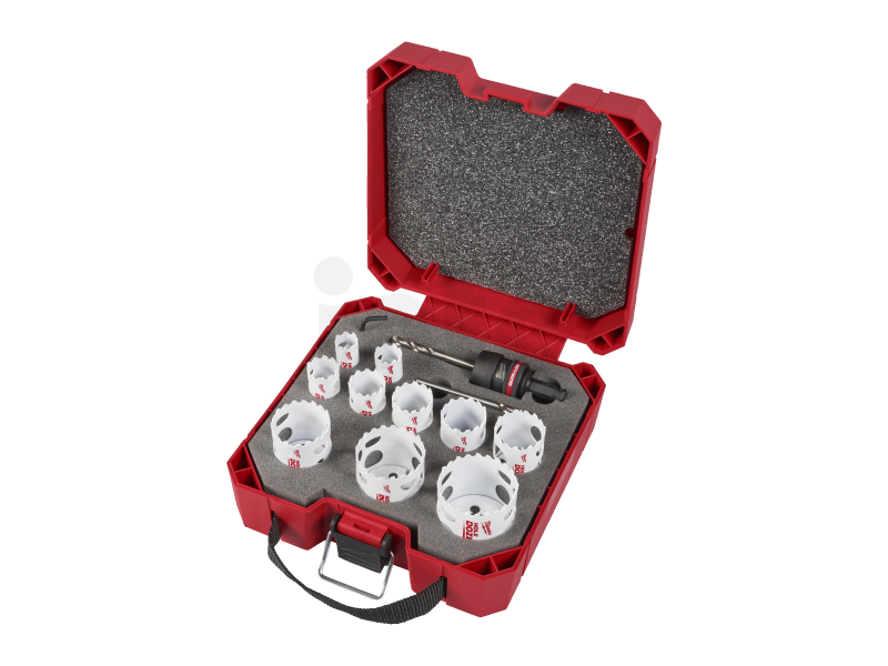 | Obsahuje | 10 x děrovka: ⌀ 19, 22, 25, 29, 32, 35, 38, 44, 51, 57 mm. <br/>Quik Lok™ unašeč vč. středícího vrtáku.<br/>4 x malý adaptérs, 5 |