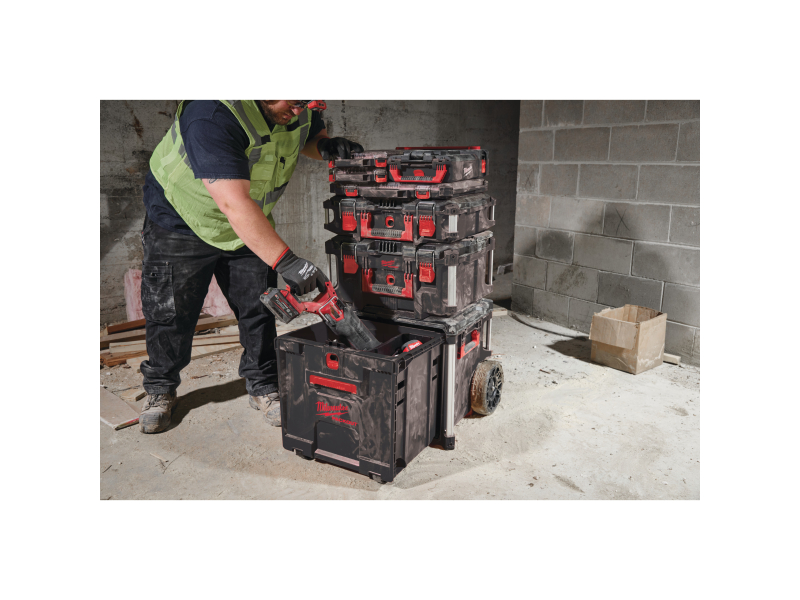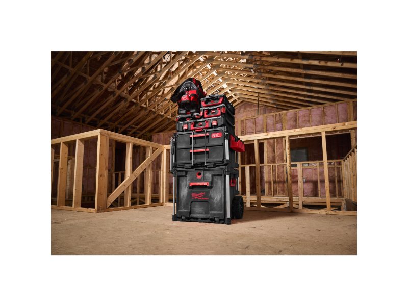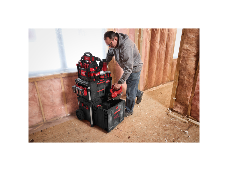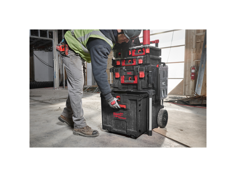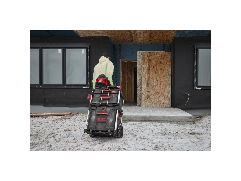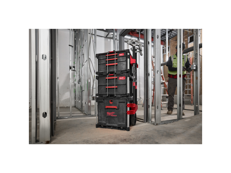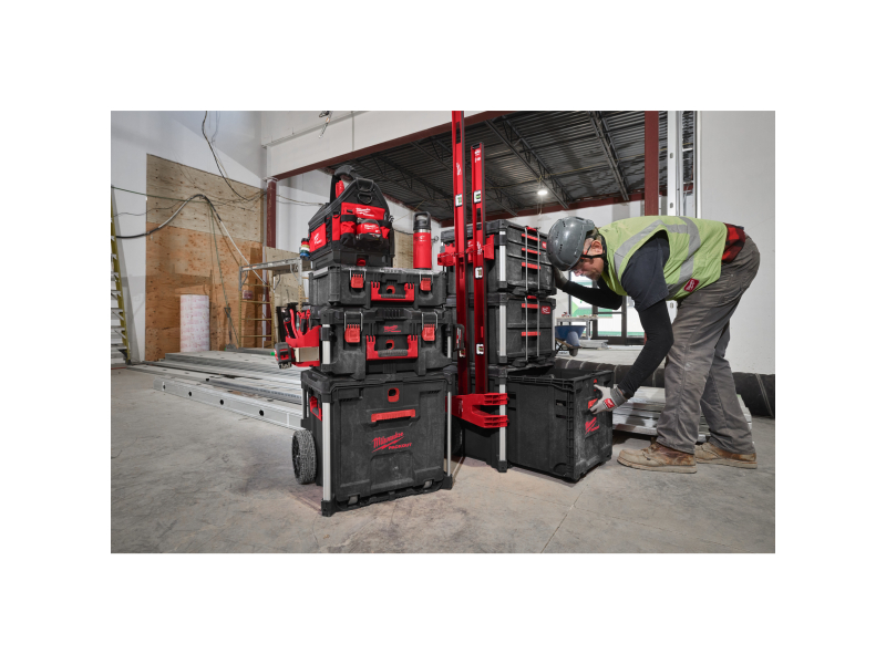Velkou výhodou je rychlý a snadný přístup k nářadí, aniž by bylo nutné vybalovat boxy uložené nahoře. Boční držáky lze namontovat na kovové tyče, což přidává flexibilitu při manipulaci a přepravě. Kufr je plně kompatibilní s modulárním skladovacím systémem PACKOUT™, což umožňuje jeho snadnou integraci s dalšími PACKOUT™ produkty.