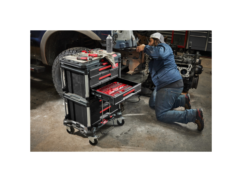 Obsahuje Skládá se z: vozíku PACKOUT™, boxu se 2 zásuvkami PACKOUT™, boxu se 3 zásuvkami PACKOUT™ a pracovní desky PACKOUT™.