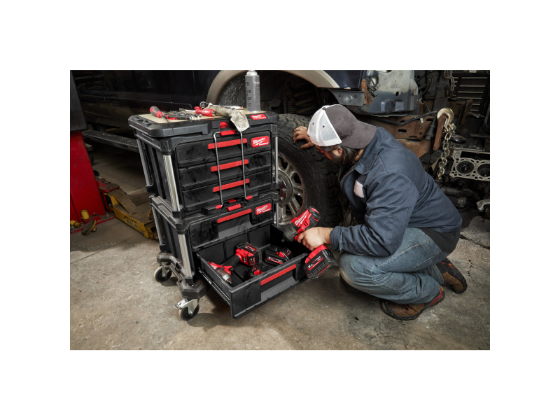 Skládá se z: vozíku PACKOUT™, boxu se 2 zásuvkami PACKOUT™, boxu se 3 zásuvkami PACKOUT™ a pracovní desky PACKOUT™.