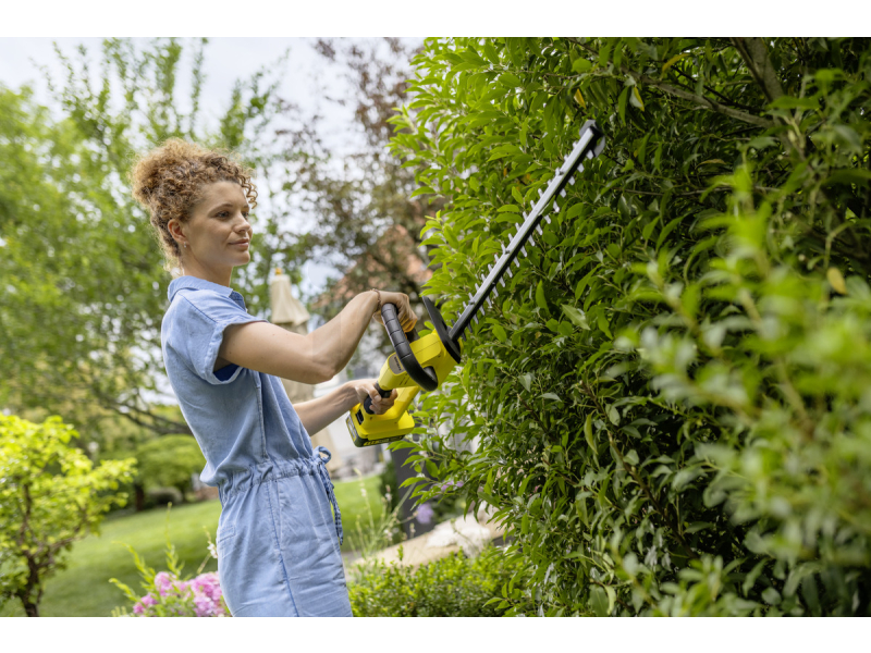 Nůžky na živý plot KÄRCHER HGE 3-18 Battery Set představují výkonné akumulátorové řešení pro údržbu zahrady s maximálním komfortem práce. Díky otočné rukojeti o 90° vlevo i vpravo umožňují přirozenou pracovní polohu při vertikálním i horizontálním střihu, což výrazně snižuje únavu při delším používání a zajišťuje pohodlí pro praváky i leváky.