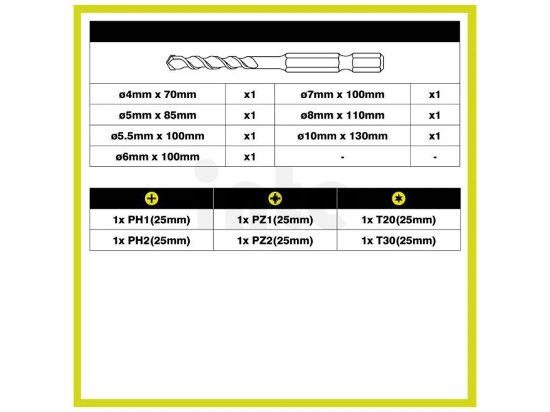 - 6× 25 mm nástrčné bity: PH1, PH2, PZ1, PZ2, TX20, TX30