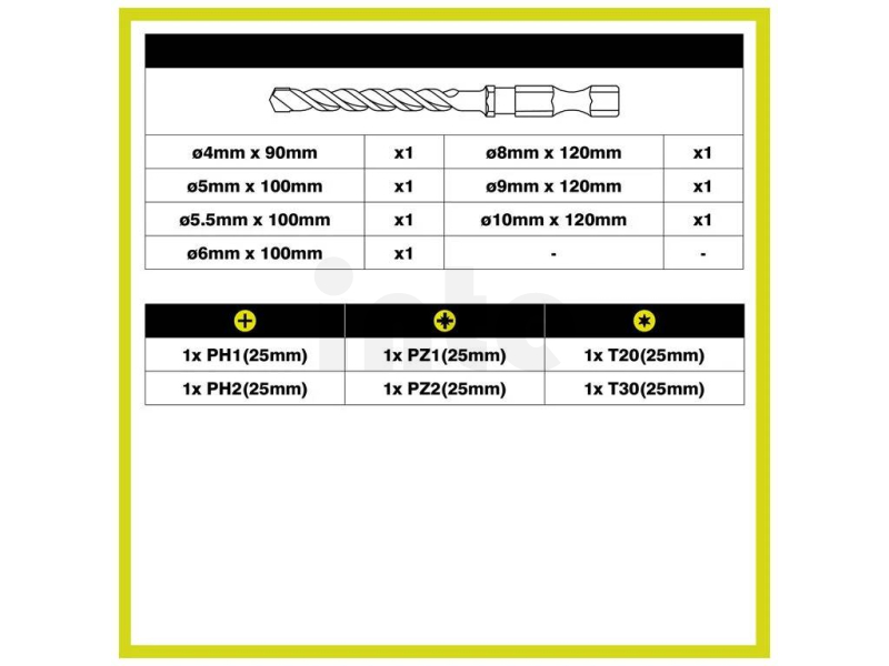 - 6× 25 mm nástrčné bity: PH1, PH2, PZ1, PZ2, TX20, TX30