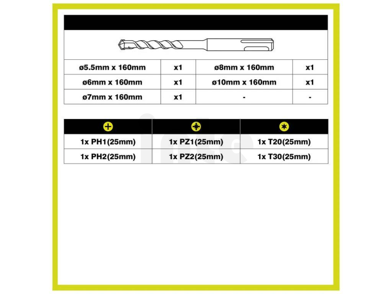 • 5× SDS Plus 2řezné vrtáky:1× 5,5 mm, 1× 6 mm, 1× 7 mm, 1× 8 mm, 1× 10 mm